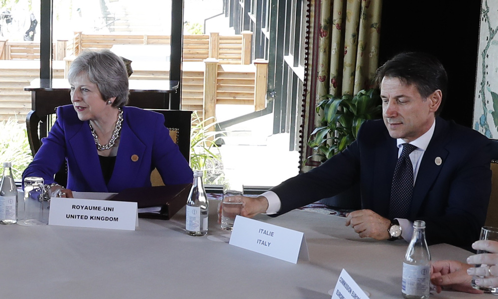 Theresa May og Giuseppe Conte under G7 i Quebec den 8. juni 2018. Foto: Yves Herman / Reuters / Scanpix.