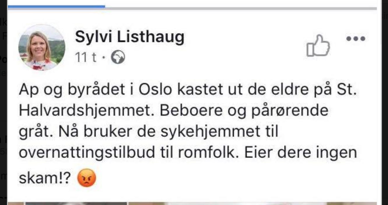 Det som har fått mediene til å gå av skaftet er den lille facebook-posten hvor Listhaug spurte om Oslo kommune eide skam, som kastet ut 60 gamle fra St.Halvardshjemmet og erstattet dem med 78 romfolk som betaler 15 kr. natta.