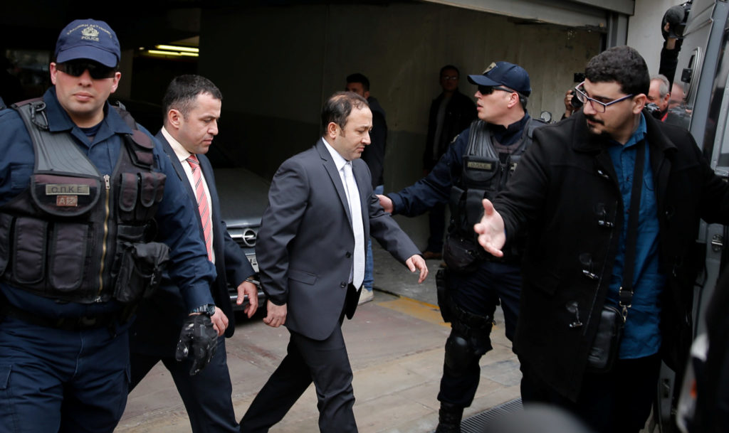 To av åtte tyrkiske offiserer som fløy til Hellas og ba om politisk asyl, eskorteres av politiet fra en ankedomstol i Athen. Den tredje har nå fått innvilget asyl av en domstol. Foto: Costas Baltas/Reuters/Scanpix