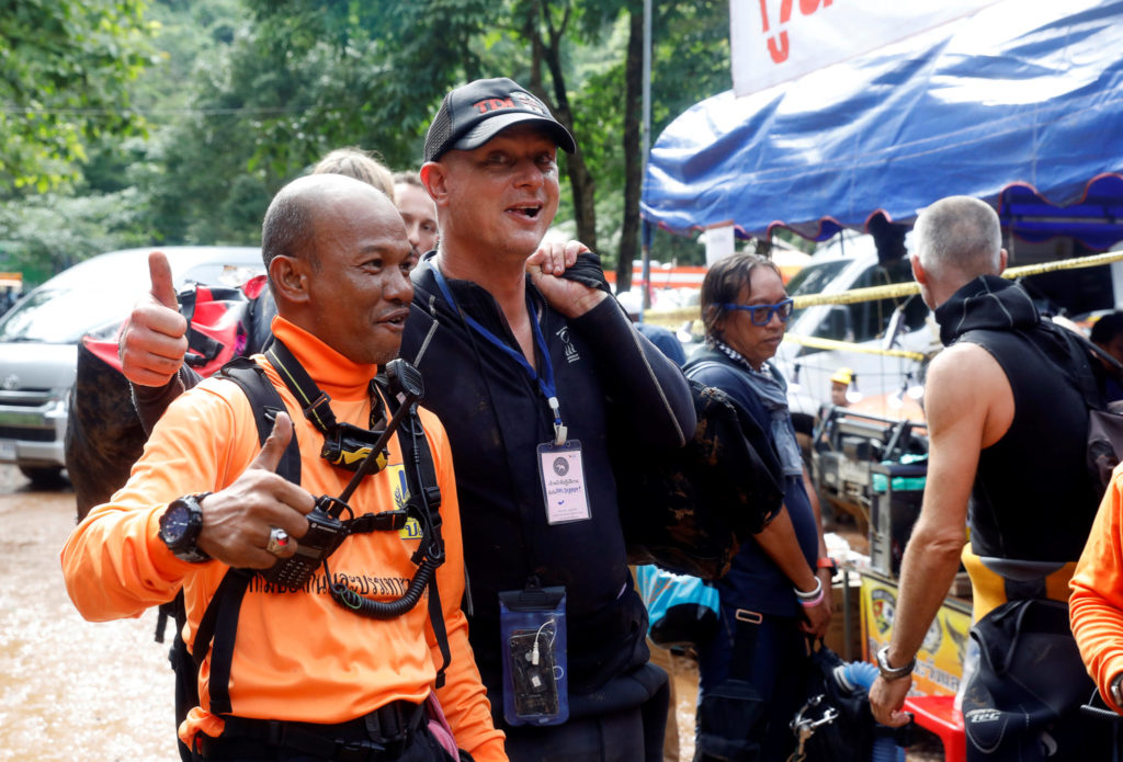 Thailandske og utenlandske dykkere manifesterer optimisme under redningsaksjonen for å få ut de tolv ungguttene og treneren deres fra en grotte i Tham Luang. Foto: Soe Zeya Tun / Reuters / Scanpix.