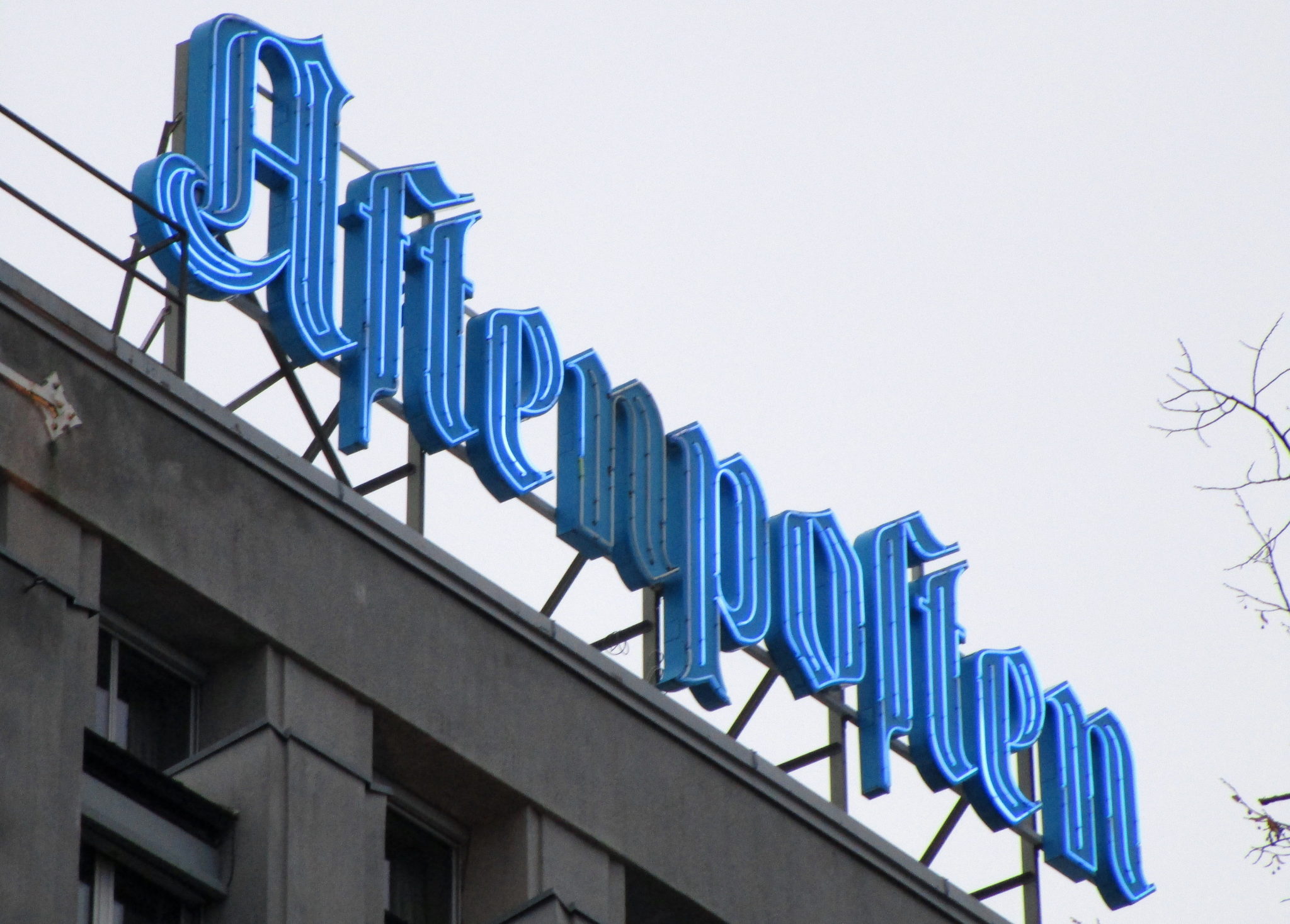 Lysreklame for Aftenposten på taket av Høyres Hus i Oslo sentrum. Foto: Stig Rune Pedersen / Creative Commons Attribution ShareAlike 3.0.