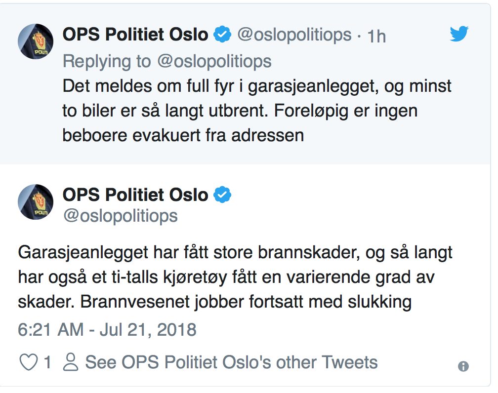 Den første brannen begynte i Åslandhellinga. Tre biler fikk store skader og politiet fant det nødvendig å evakuere 34 i nærliggende boliger. Kl 06.30 hadde politiet slukket og drev bevissikring.