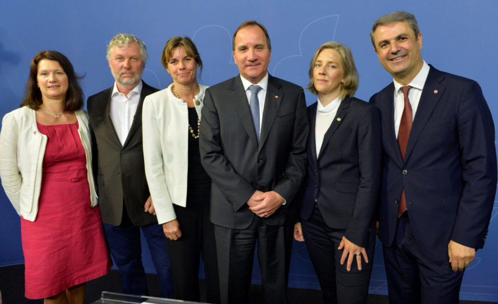 Statsminister Stefan Lofven poserer sammen med flere av sine statsråder, Peter Eriksson nr to fra venstre. Foto TT / Jonas Ekstromer / via Reuters / Scanpix