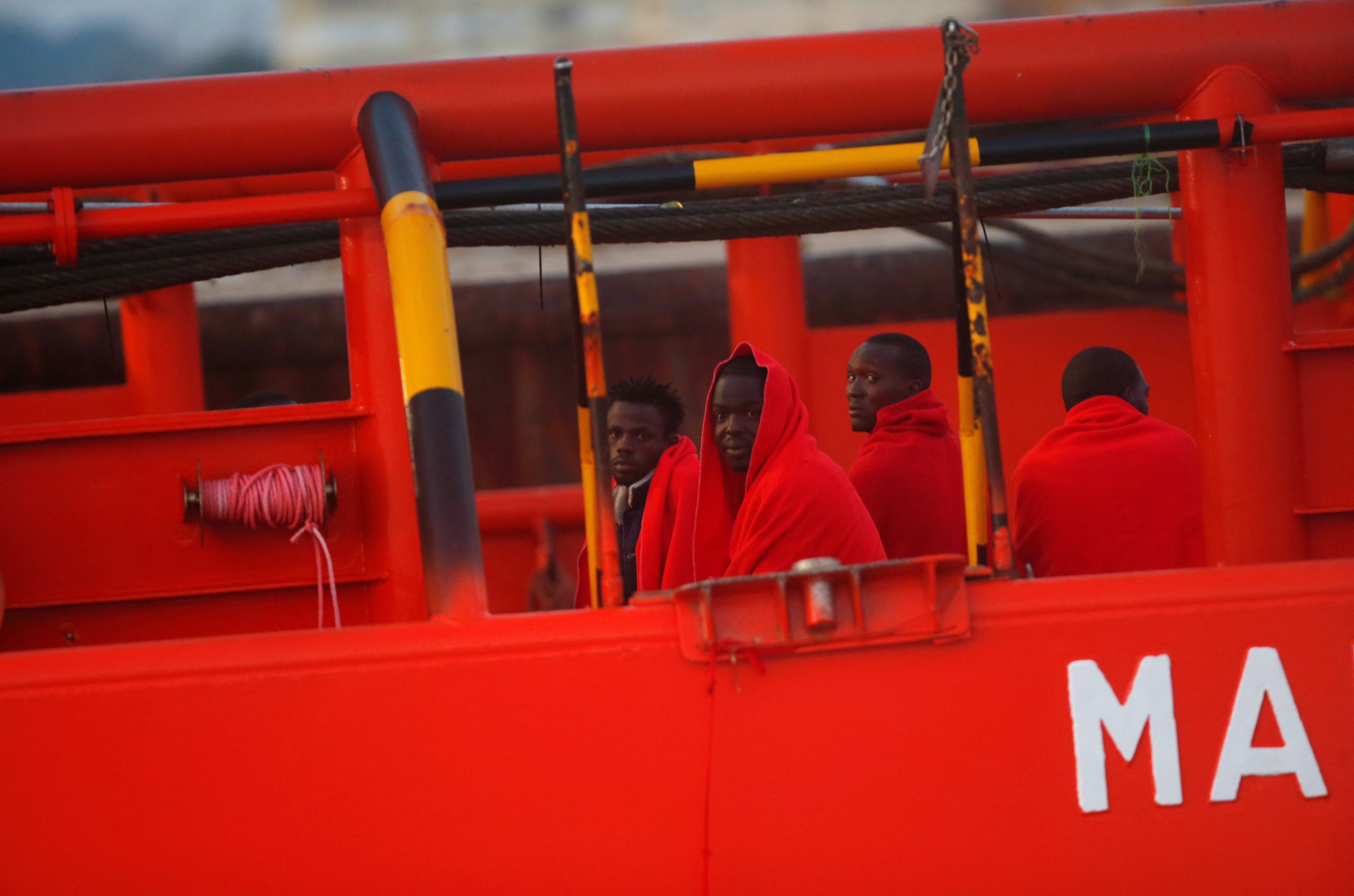 Migranter som er blitt hentet opp fra en gummibåt i Gibraltarstredet, befinner seg ombord på det spanske redningsfartøyet «Maria Zambrano», som legger til kai i San Roque ikke langt fra Algeciras den 10. august 2018. Foto: Jon Nazca / Reuters / Scanpix.