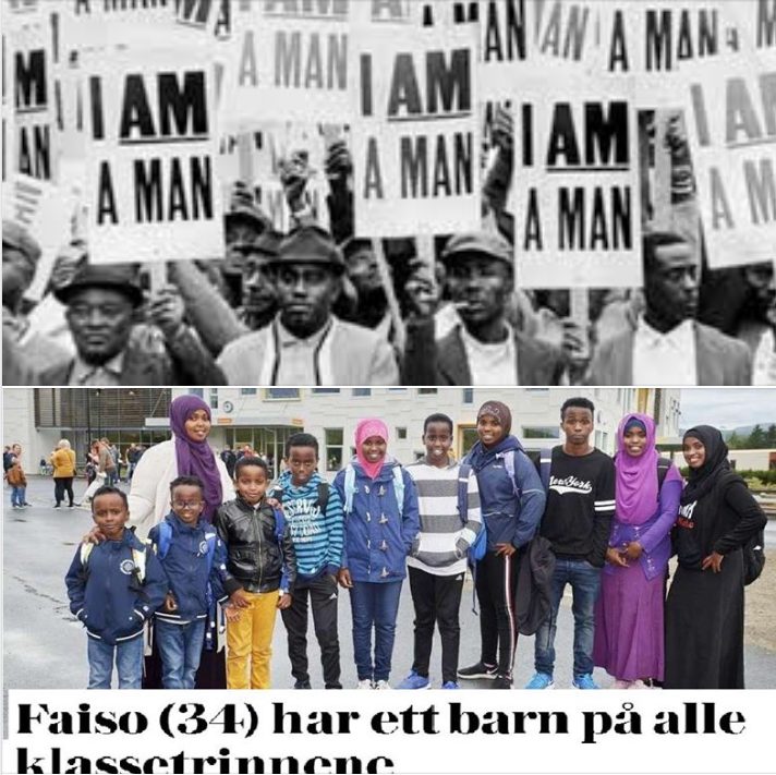 I 1968 gikk svarte renovasjonsarbeidere i Memphis ut i en omfattende streik. Slagordet deres var «I am a man». Femti år senere: Trønder Avisa og VG skriver om en somalisk ti-barnsmor som har «ett barn på hvert trinn» ved skolestart.