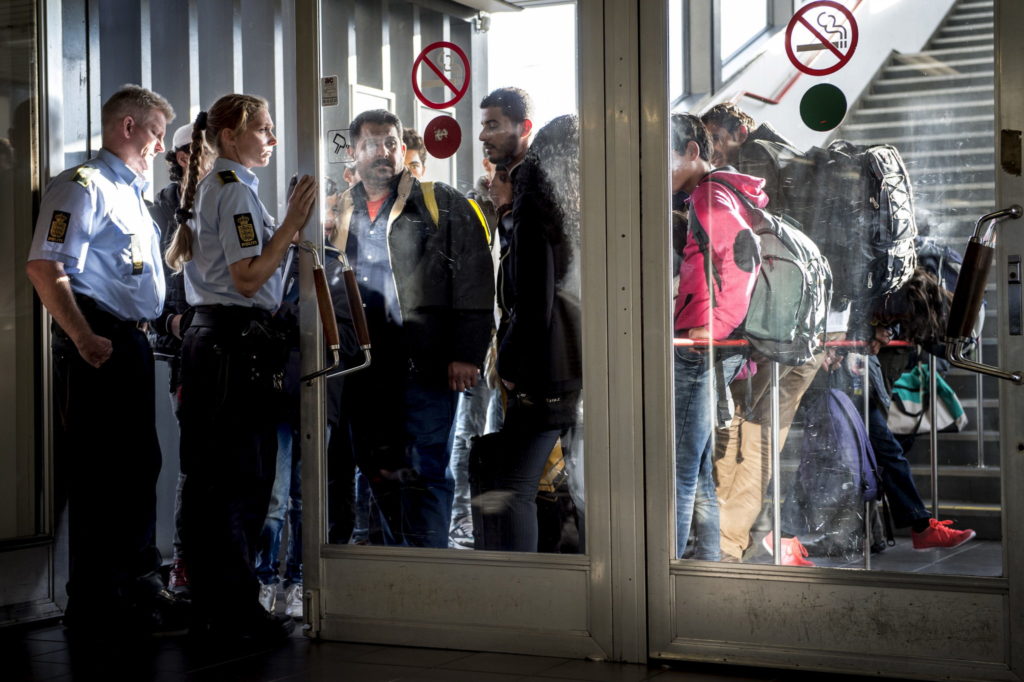 Migranter blitt møtt av politiet idet de kommer til Rødby i Danmark den 8. september 2015. Foto: Jens Norgaard Larsen / Reuters / Scanpix.