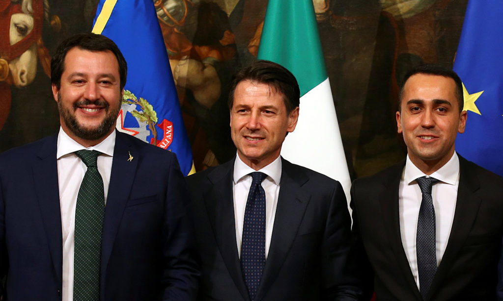 Italias statsminister Giuseppe Conte omgitt av sine visestatsministre Matteo Salvini og Luigi Di Maio. Foto: Alessandro Bianchi / Reuters / Scanpix.