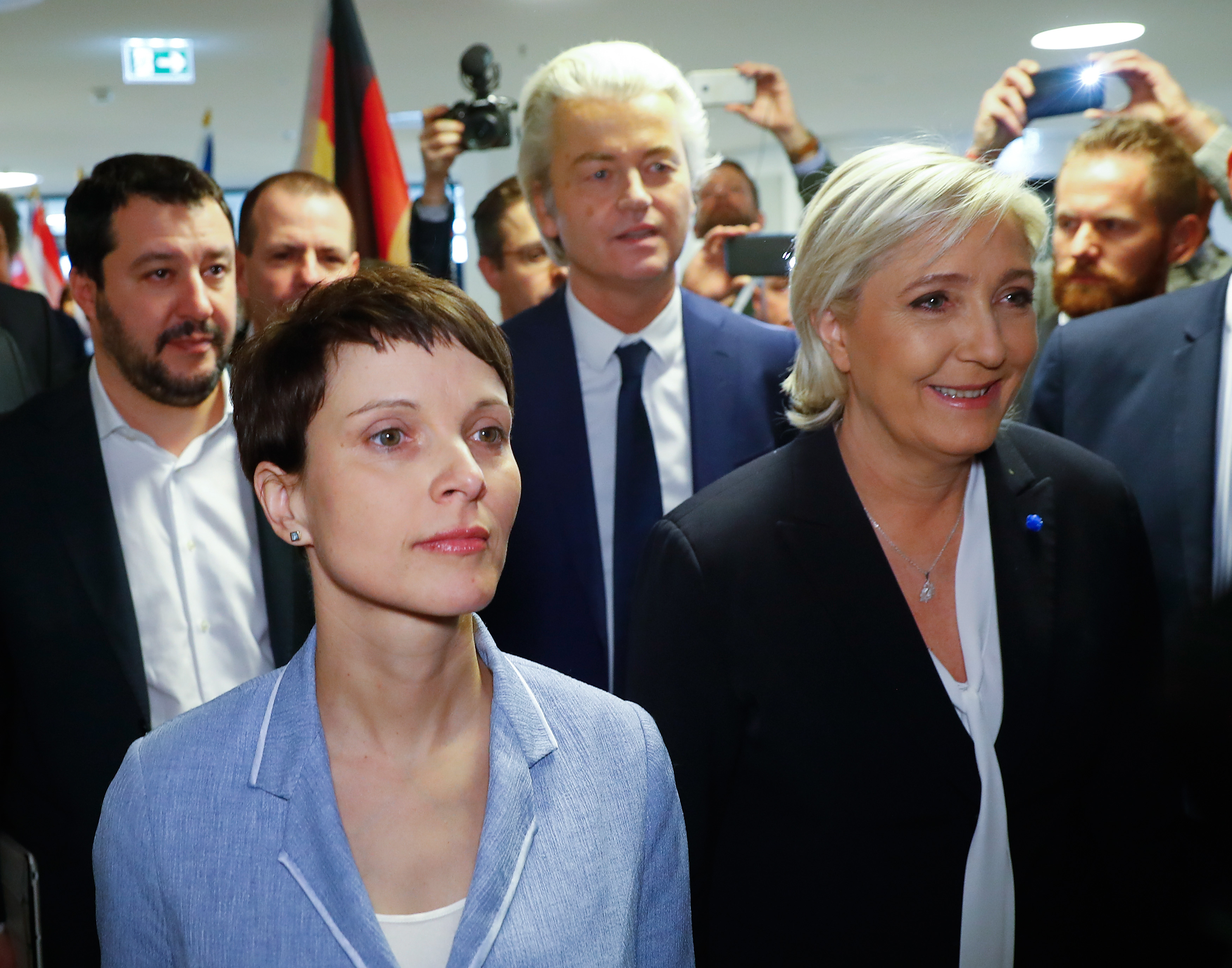 Matteo Salvini, Frauke Petry, Geert Wilder og Marine Le Pen under et møte i Koblenz den 21. januar 2017. Foto: Wolfgang Rattay / Reuters / Scanpix.