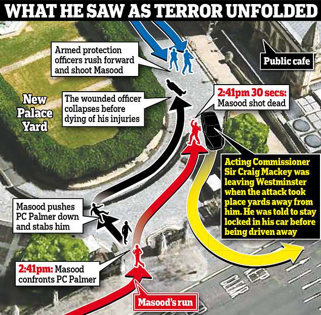 Sir Craig Mackey, nestleder i Metropolitan Police, er blitt sterkt kritisert etter at det under høringen ble avdekket at han hadde låst seg inne i bilen før han ble kjørt vekk mens politibetjent Keith Palmer ble knivstukket til døde utenfor parlamentet i mars i fjor. Bilen han satt i kjørte forbi den sårede Palmer som kollapset og døde like etterpå.