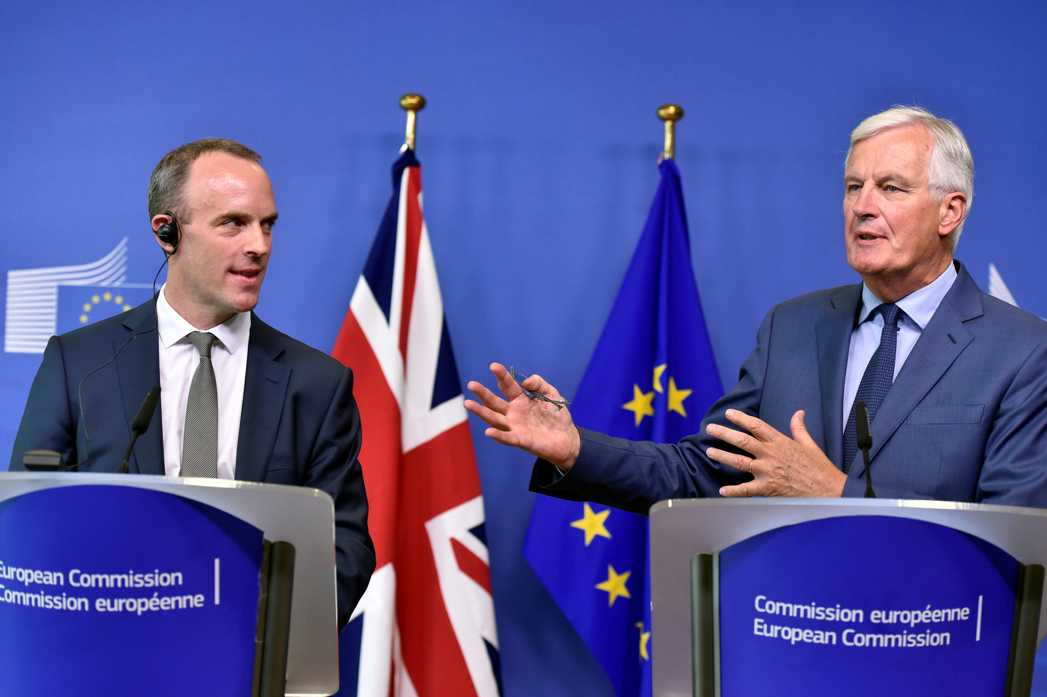 Storbritannias Brexit-minister Dominic Raab og EUs Brexit-forhandlingssjef Michel Barnier. Foto: Eric Vidal / Reuters / Scanpix.