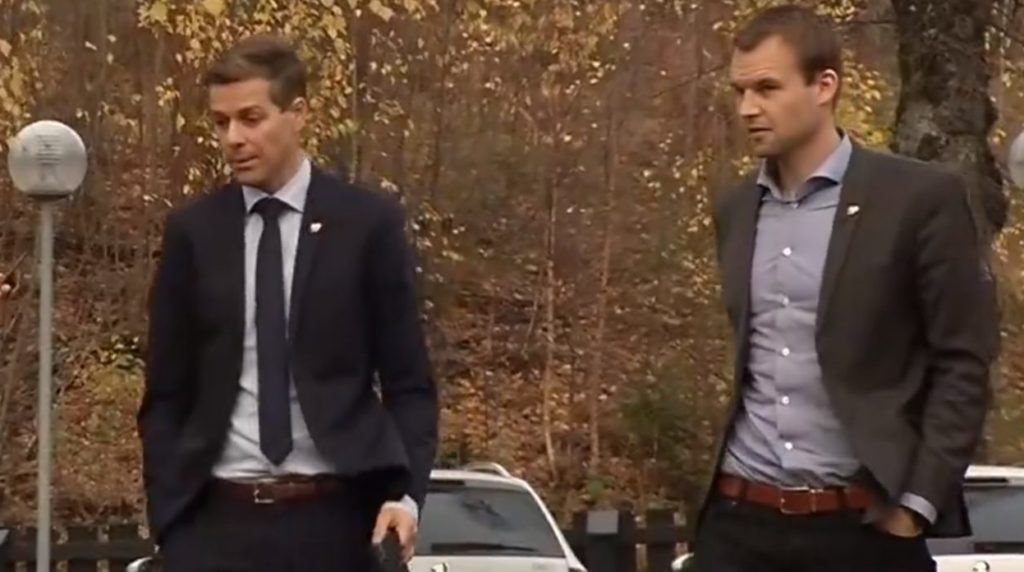 KrF-leder Knut Arild Hareide og nestleder Kjell Ingolf Ropstad ankommer det utvidede fylkesstyremøtet i Buskerud KrF på Sole hotell ved Norefjell i går.