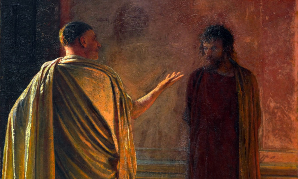Nikolai Ge (1831–1894), detalj fra maleriet «Hva er sannhet? Kristus fremfor Pilatus» (1890), olje på lerret, Tretjakovgalleriet, Moskva. Etter Johannes 18, 38. «Quid est veritas?», lyder Pilatus’ spørsmål på latin. Anagrammet «est vir qui adest» er et tenkt svar: «Det er mannen her fremfor deg». Foto: Wikimedia Commons (utsnitt).