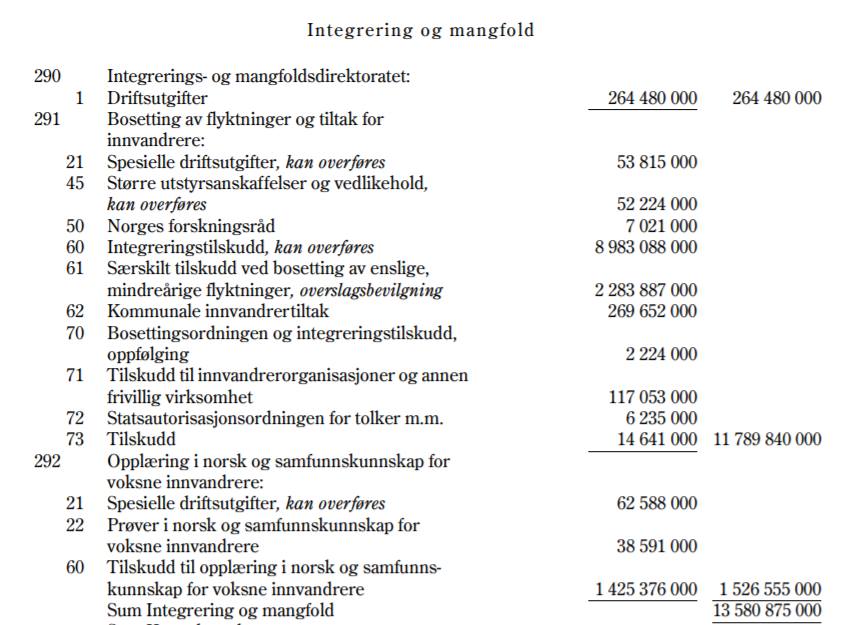 Samtidig har det forelagte budsjettet en samlet post på «Integrering- og mangfold» som er på hele 13,5 MILLIARDER kroner, hvorav hele 2,3 MILLIARDER alene skal brukes på enslige mindreårige asylsøkere.