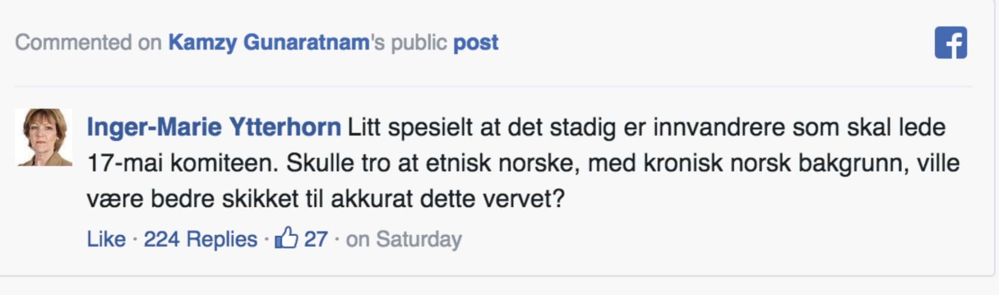 Inger-Marie Ytterhorn sa ikke noe galt, og det hun sa hadde ingenting med rasisme å gjøre. Hun bemerket at det er påfallende at vår nasjonale festdag skal ledes av folk som kommer fra andre kulturer. Hvis 17.mai-komiteen skal gjenspeile et nytt Norge, hvorfor er det aldri polakker eller baltere som trekkes frem?