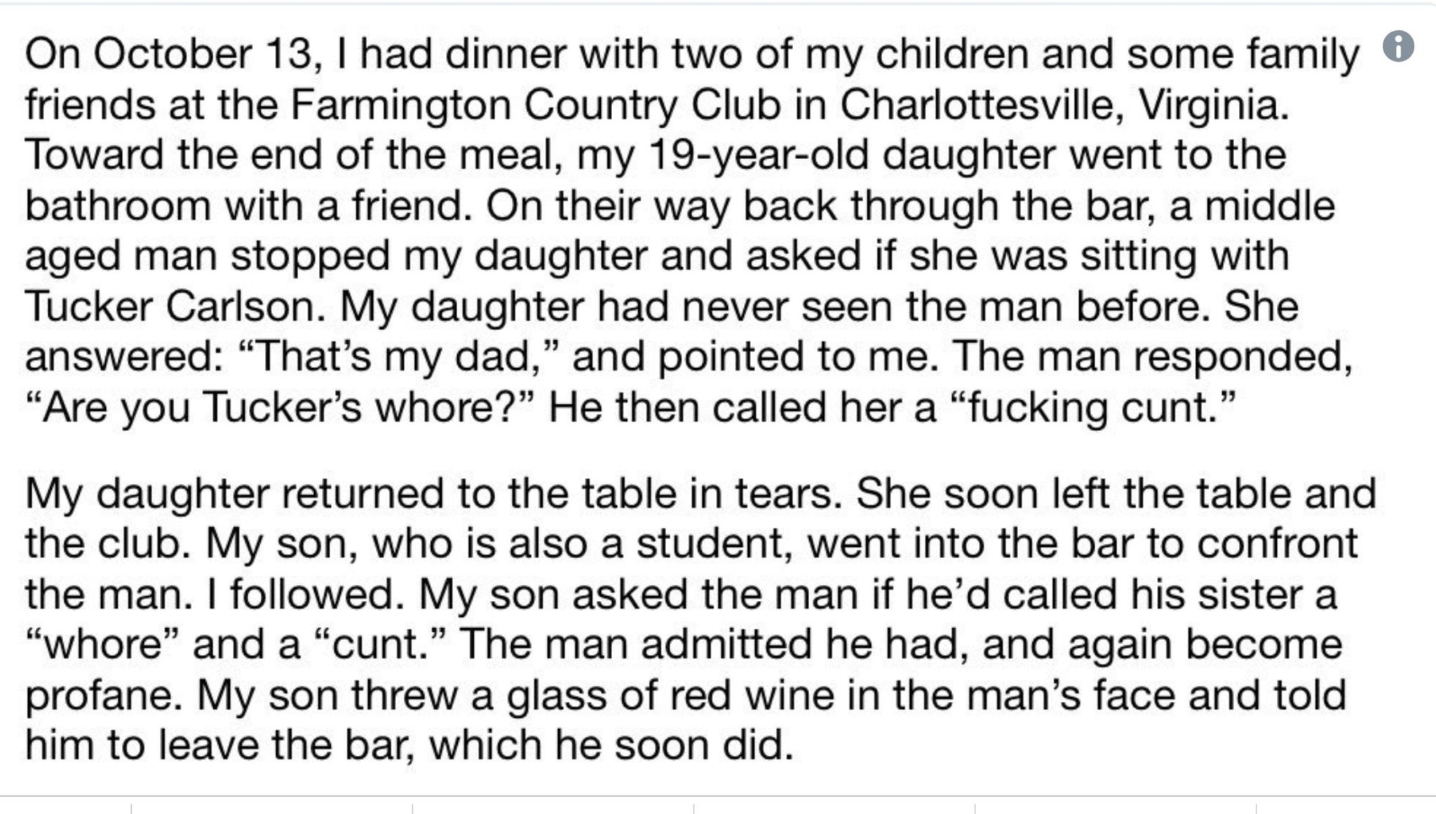 Men historien stopper ikke der. Sist søndag spiste Tucker middag med kona og to av barna på en countryclub i Charlottesville, Virginia. Der var det en mann som oppførte seg svært uhøflig mot Tuckers datter. Han forulempet henne rett og slett.