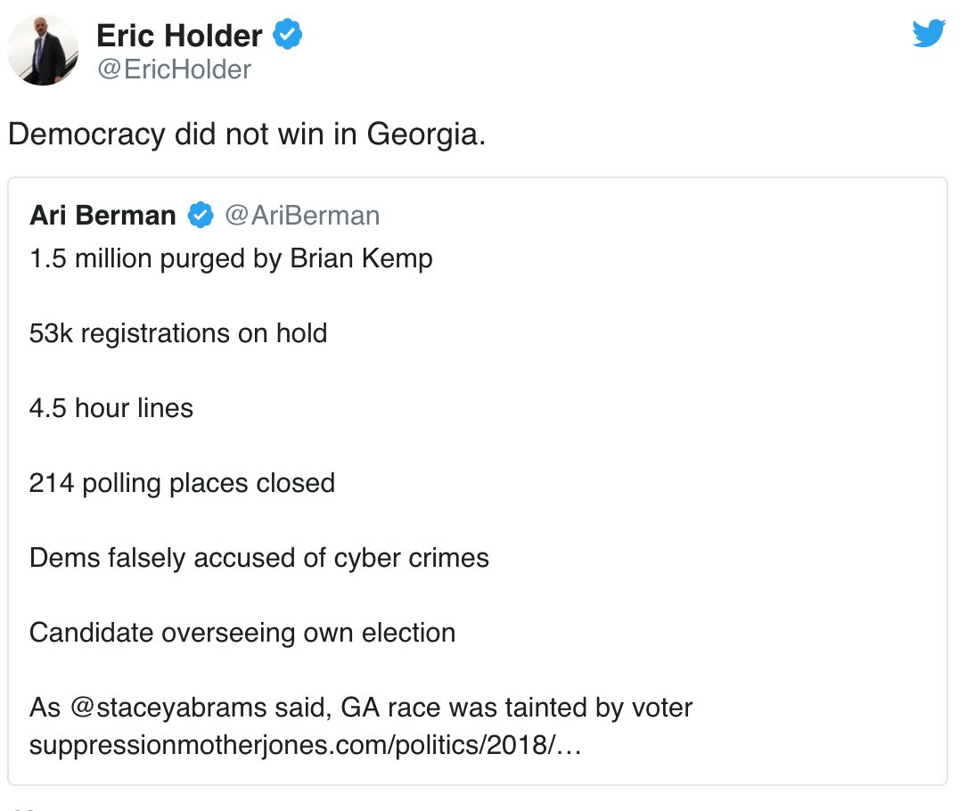 Ifølge Hillary Clinton skulle Stacey Abrams ha vunnet guvernørvalget i Georgia. Når hun ikke vant må det ha vært noe galt med valget. Samme logikk følger tidligere justisminister Eric Holder: Hvis ikke den demokratiske kandidaten vinner skyldes det juks.