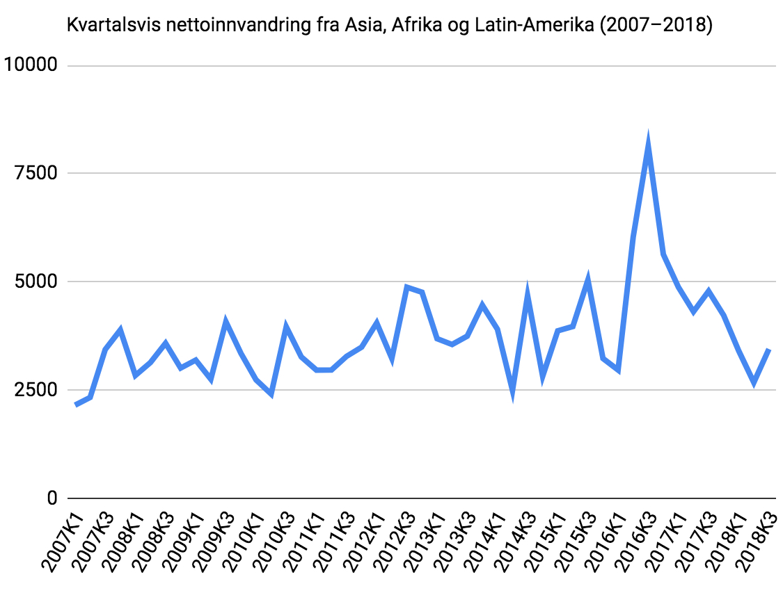 Hittil i 2018 har den ikke-vestlige nettoinnvandringen vært på 9541 personer, hvilket tilsvarer et kvartalsgjennomsnitt på 3180 i inneværende år – noe lavere enn 3742 for hele den drøye tiårsperioden.