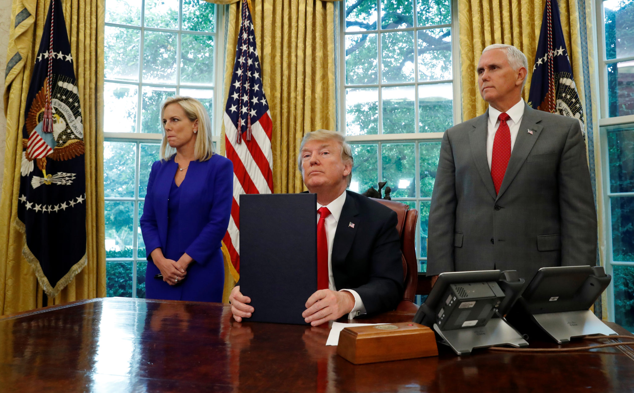 USAs president Donald Trump, visepresident Mike Pence og Department of Homeland Security-sjef Kirstjen Nielsen møter pressen etter signering av et innvandringspolitisk presidentdekret i Det hvite hus i Washington den 20. juni 2018. Foto: Leah Milllis / Reuters / Scanpix.