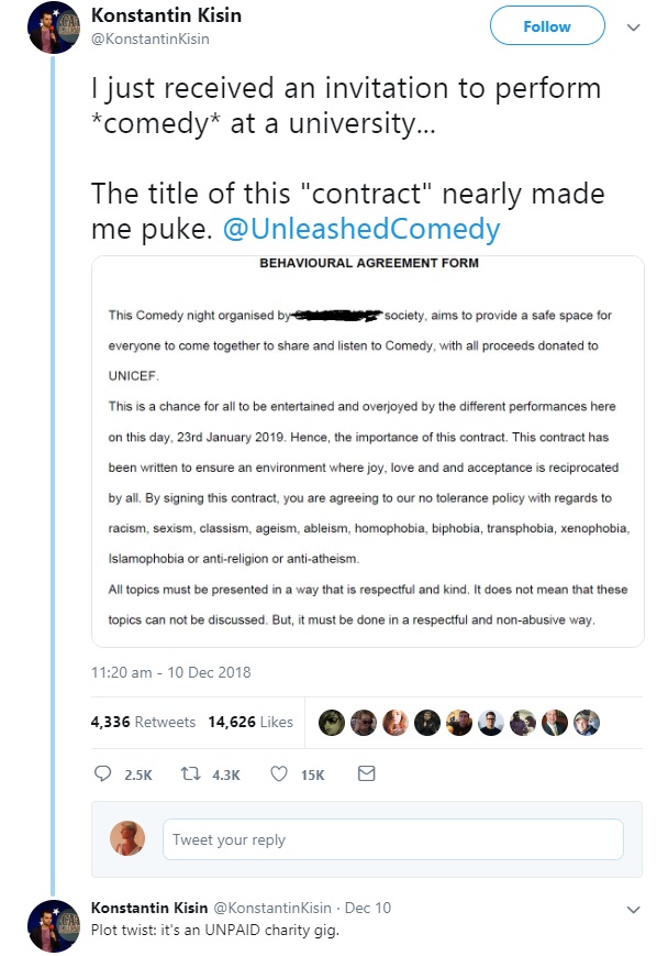 Komikeren Konstantin Kisin fikk beskjed om å skrive under på «oppførselskontrakt» før forestillingen på School of Oriental and African Studies (SOAS) i London. Vitsene hans måtte være snille og respektfulle, mente lederne av studentforeningen som sa at kontrakten var nødvendig for å ivareta «safe space» og et sted for «glede, kjærlighet og aksept». Det var en hel rekke […]