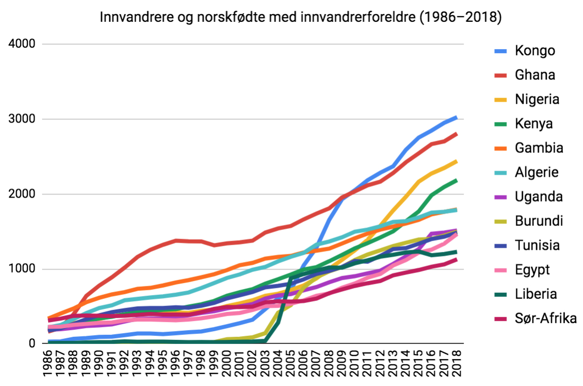I 1986 var det noe over 5000 afrikanere i Norge. I dag er den afrikanske innvandrerbefolkningen omlag tjuefem ganger større enn for trettito år siden. Med jevn prosentvis vekst hvert år, ville det ha tilsvart en årlig økning på ca. ti prosent.