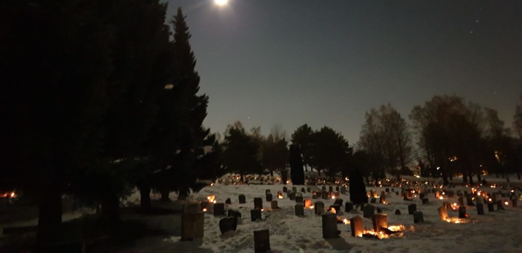 Der hvor vi skulle parkere sto nok en politibil med blålysene på. Nå tenkte vi at det kanskje var best å spørre om hva som foregikk ettersom det ikke virket veldig trygt å gå inn på den mørklagte kirkegården, gravlys og fullmåne til tross. Ved første samtale med politiet ble vi bedt om å vente en liten stund i bilen da de var på jakt etter en ettersøkt mann. Vi kunne gå inn med gravlys når politiet hadde forlatt stedet, sa de.