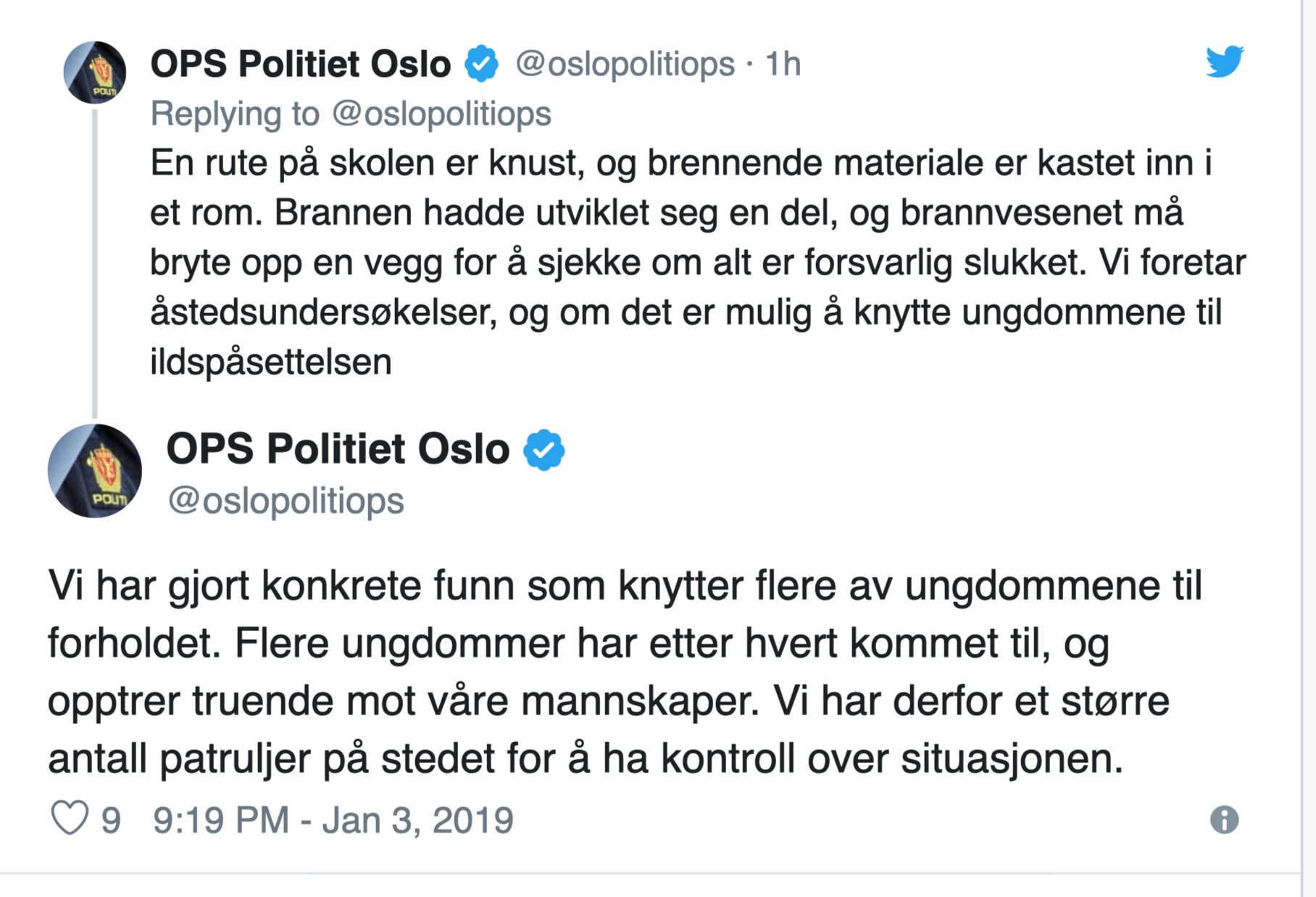 En rute på skolen var knust, og brennende materiale var kastet inn i et rom. Politiet melder at brannen hadde utviklet seg en del, og brannvesenet måtte bryte opp en vegg for å sjekke om alt var forsvarlig slukket.