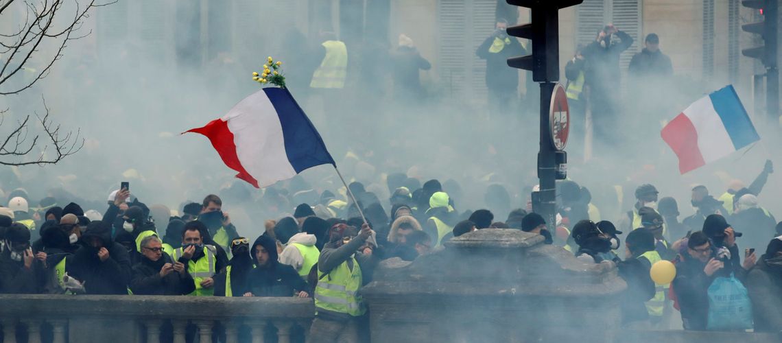 Regjeringstalsmann Benjamin Griveaux sa fredag at de gjenværende gule vestene var agitatorer som skulle slås ned. Et døgn senere måtte han flykte ut bakdøren på sitt kontor. Demonstrantene hadde fått tak i en truck og pløyde seg vei inn hoveddøren.