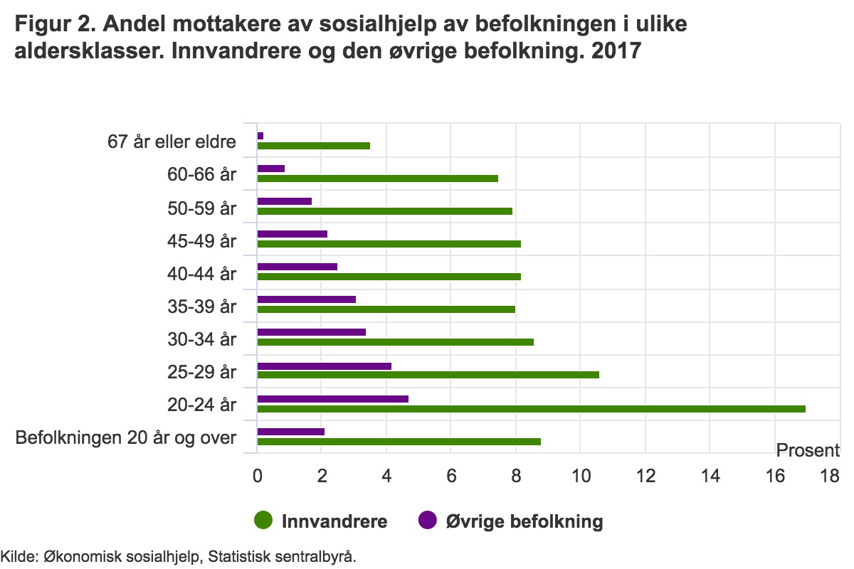 SSBs oversikt over sosialhjelpsmottagere etter aldersgrupper viser overrepresentasjon av innvandrere over hele spekteret, men forskjellen er spesielt stor i alderen 20–24 år: