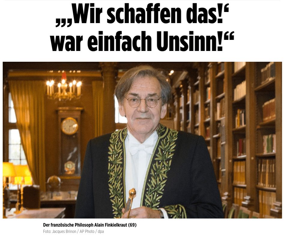 Alain Finkielkraut forteller at den som mest aggressivt ropte «Frankrige tilhører oss» sist helg i Paris, ikke var en franskmann, men en salafist. Med det mener han “”Frankrike er bestemt til å bli muslimsk territorium.”