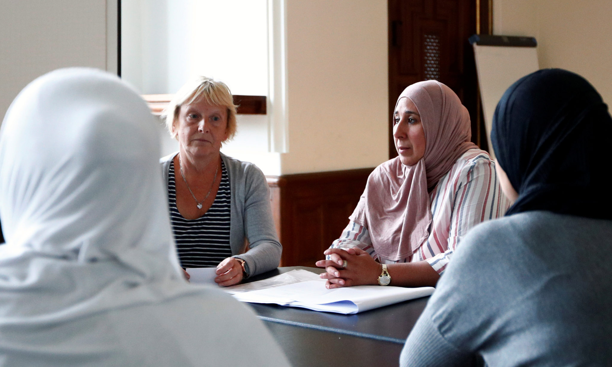 Suzanne Anciaux og Nabila Mazouz deltar i et møte med Jihad van de Moeders, «mødrenes jihad», i Antwerpen den 8. september 2018. Den frivillige organisasjonen prøver å få jenter og kvinner med belgisk statsborgerskap som sitter i kurdisk fangenskap i Syria, tilbake til Belgia. Foto: Francois Lenoir / Reuters / Scanpix.