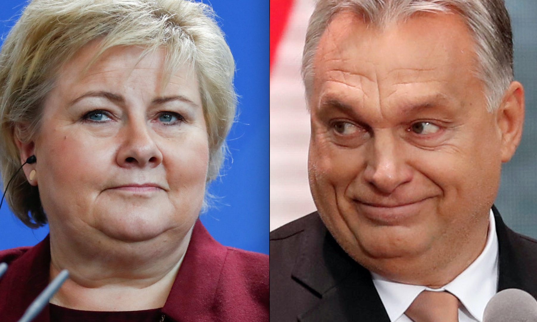 Erna Solberg og Viktor Orbán. Fotografier: Fabrizio Bensch og Bernadett Szabo / Reuters / Scanpix.