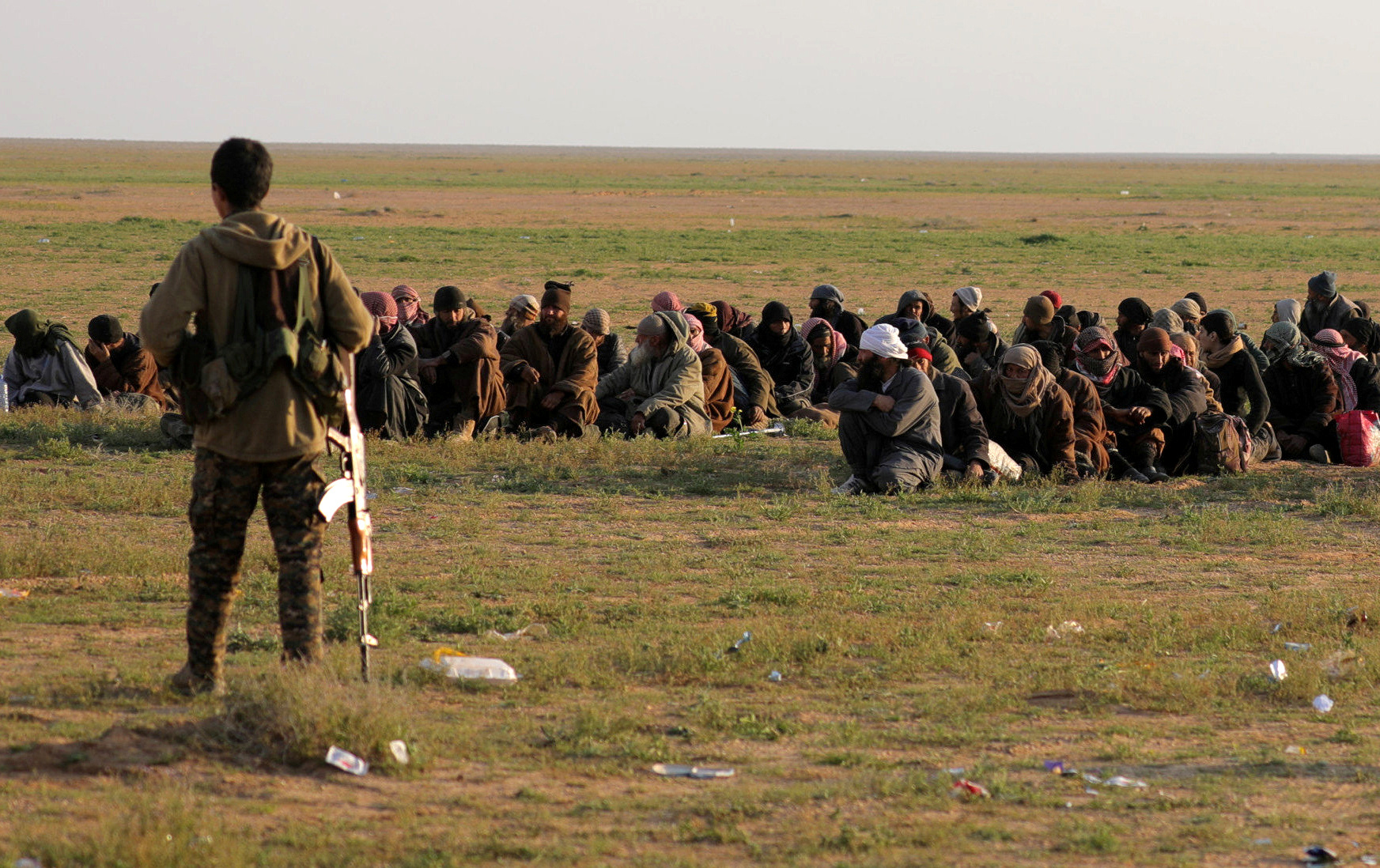 Et medlem av Syrian Democratic Forces (SDF) holder oppsyn med en gruppe personer som er evakuert fra Baghouz i den syriske Deir Al Zor-provinsen, en av den islamske statens siste skanser, den 22. februar 2019. Foto: Rodi Said / Reuters / Scanpix.