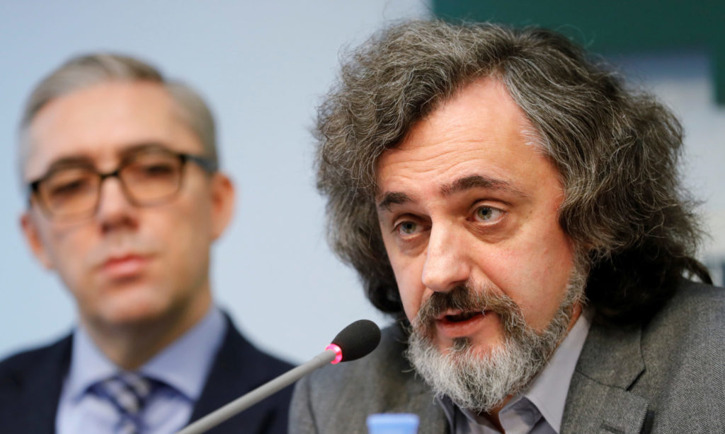 Leder av SOVA-senteret under en pressekonferanse i Moskva i anledning av at det danske Jehovas Vitner-medlemmet Dennis Christensen ble dømt til seks års fengsel for å ha organisert en ekstremistgruppe, 8. februar. Foto: Tatjana Makejeva/Reuters/Scanpix