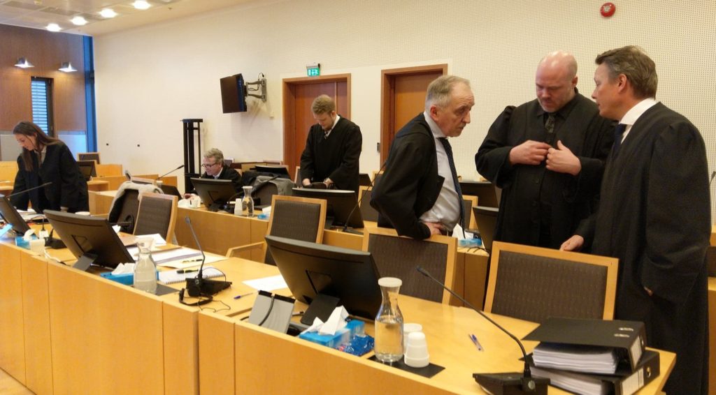 Folksomt i rettssal 828: Forsvarerne Victoria Palm, Bjørn Rudjord, Finn Krokeide, Thomas Rafen Wyller, Øivind Sterri og Jan Erik Teigum. Foto Øyvind Thuestad