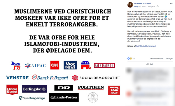 Murtaza Al-Shawi er tidligere talsmand for Imam Ali-moskéen, og har selvfølgelig personlig interesse i at lukke debatten om tidens islamisering. Bemærk den ledsagende grafik hvor terrordrabene i New Zealand, blandt andet tørres af på de tre største partier, Nye Borgerlige, Trykkefrihedsselskabet, Memri og AIPAC (American Israel Public Affairs Committee).