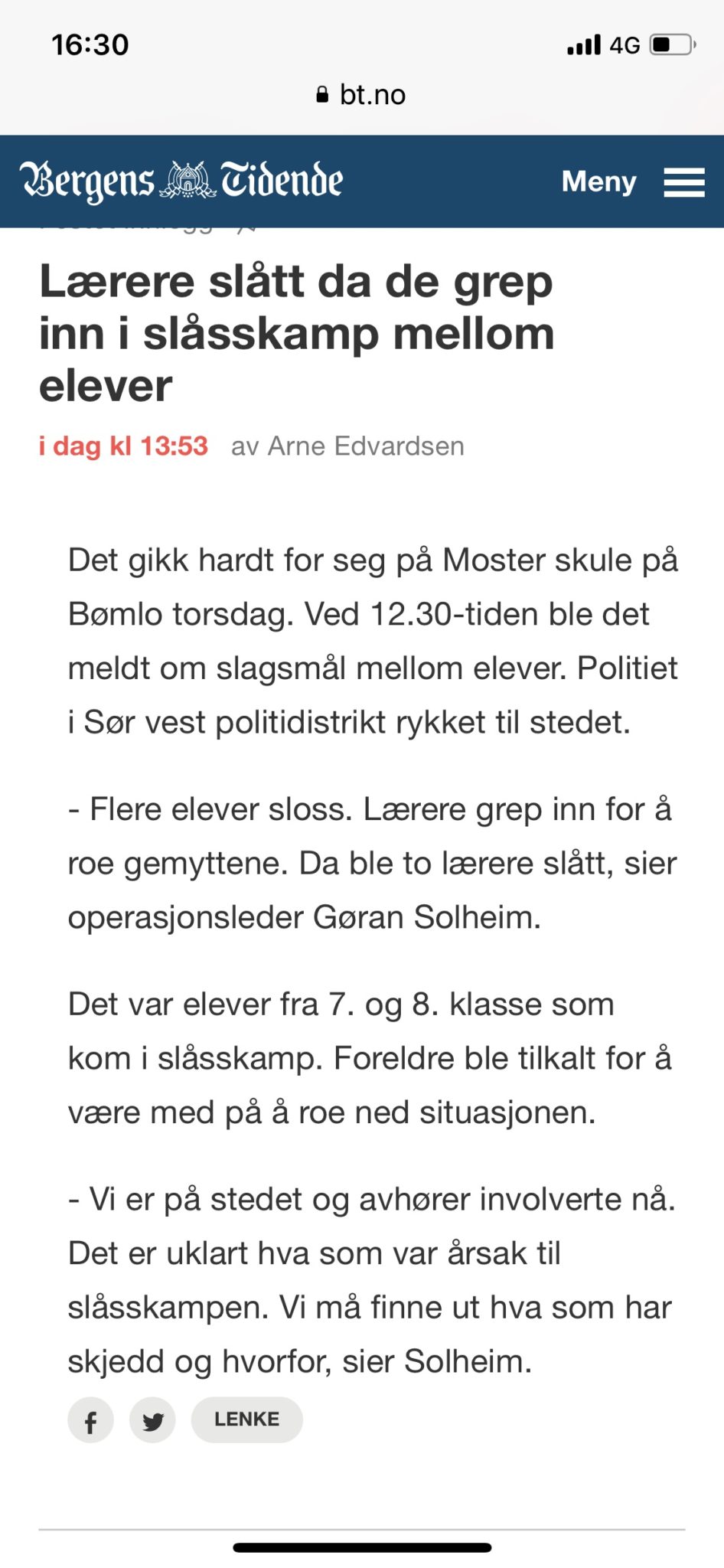 Det brøt ut slåsskamp mellom elever på 7. og 8. trinn på Moster skule på Bømlo torsdag. Da lærerne forsøkt å gripe inn ble også de slått, skriver Bergens Tidende.
