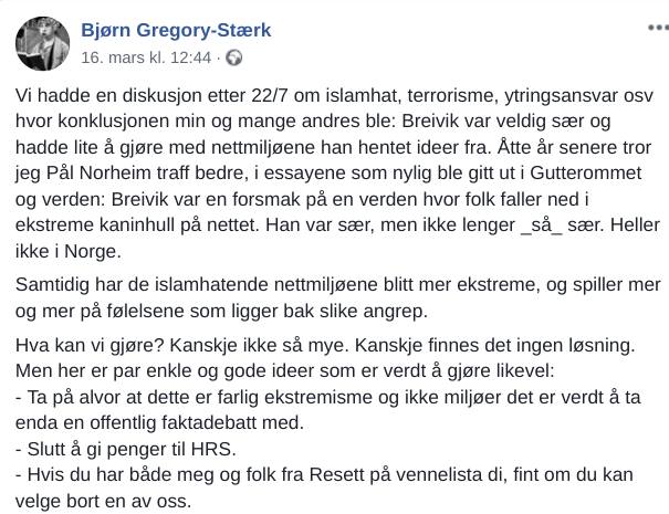 Litt mer spesielt er det at han oppfordrer alle som har ham og folk fra Resett på vennelistene sine på Facebook til å velge «en av oss».