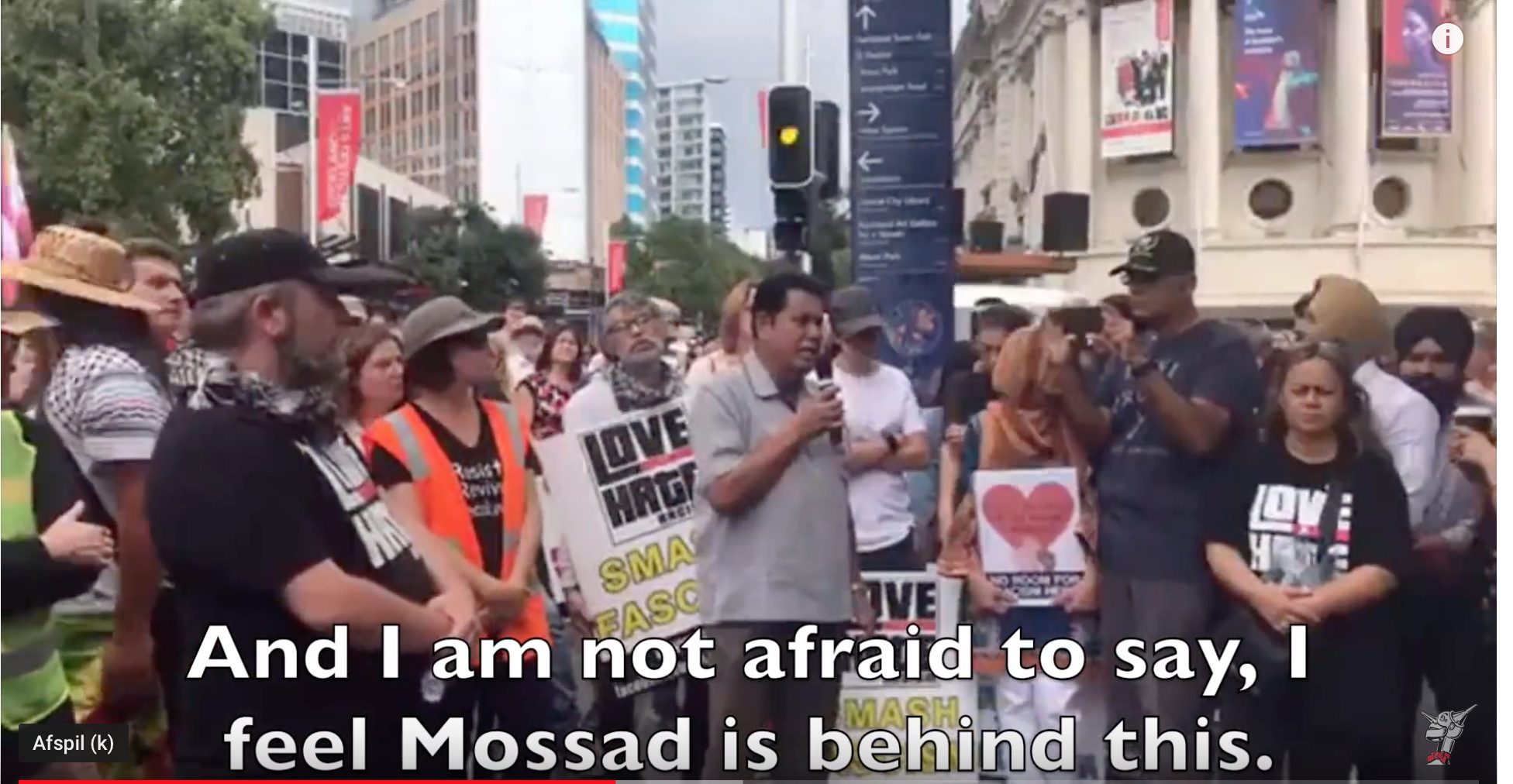 Leder for en av moskeene på New Zealand, Ahmed Bhamji, holdt sist lørdag en appell under en stor demonstrasjon mot hat i Auckland, der han stilte spørsmålet hvem som sto bak Christchurch. Han ga selv svaret: Mossad. Og ikke bare Mossad, også «zionistiske forretninger» på New Zealand.