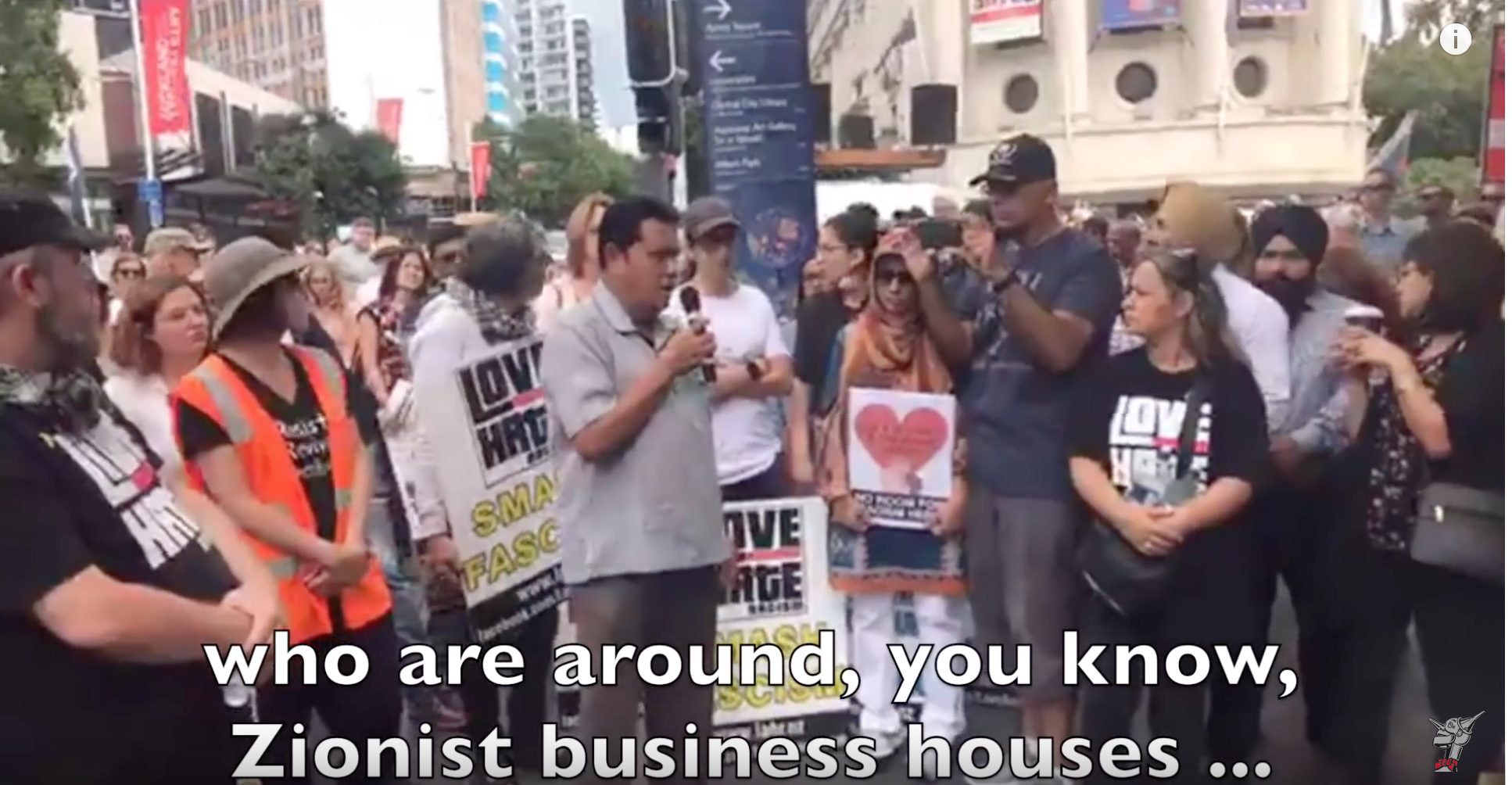 På grensen til parodi: Plakaten Love vs Hate og Smash Fascism kan skitmes bak Ahmed Bamji som åpenbart hverken kvier seg eller skammer seg for å fremføre åpen antisemittisme.
