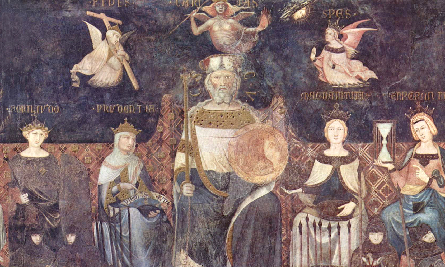 Ambrogio Lorenzetti (ca. 1290–1348), fra høyre halvpart av «Allegori over godt styresett» (1338–39), del av freskesyklus i rådhuset i Siena. Styresettet fremstilles som inspirert av de tre teologiske dydene tro, håp og kjærlighet, samt kardinaldydene mot, rettferdighet, selvbeherskelse og klokskap. Foto: The Yorck Project / Wikimedia Commons.