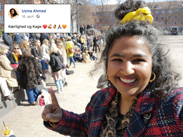 En av initiativtagerne til en annen markering, Fredsfesten på Blågårds plass, tidligere representant for Alternativet , integreringskonsulent, Uzma Ahmed, viser tawheed-symbolet. Ahmed har startet et kjærlighetsprosjekt og vil det beste, men hun forstår ikke at hun bruker det samme symbol som IS har gjort til sitt varemerke.