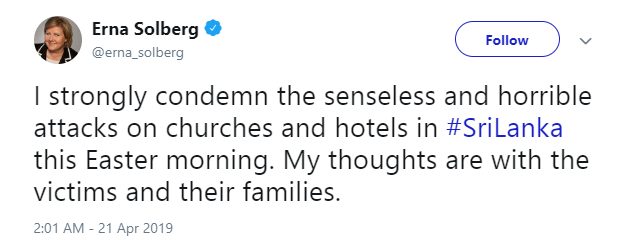 Igjen må politikerne rykke ut med kondolanser og medfølelse til jihadistenes ofre. Angrepene fordømmes. Erna Solberg kaller dem «senseless» – meningsløse. Skjønt, vi vet at islamske terrorangrep er alt annet enn meningsløse. Dette er angrep som virkelig har mening. De er koordinerte og godt planlagt. Meningen er å drepe kristne og gjerne på en symbolsk måte ved å bombe dem til døde i kirkene. Vestlige turister skal også utsettes for den meningsfylte terroren ved at luksushoteller angripes.