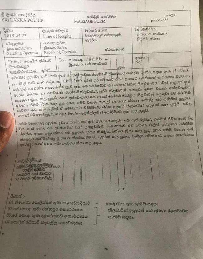 En talsperson fra politiet på Sri Lanka sier at politistasjonene i landet har blitt instruert om å lete etter et antall med spesifikke kjøretøy i forbindelse med jihadterroren i landet. Det skal dreie seg om en bil, en minivan og seks motorsykler. De lokale politistasjonene skal ha blitt gitt alle registreringsnumrene på kjøretøyene.