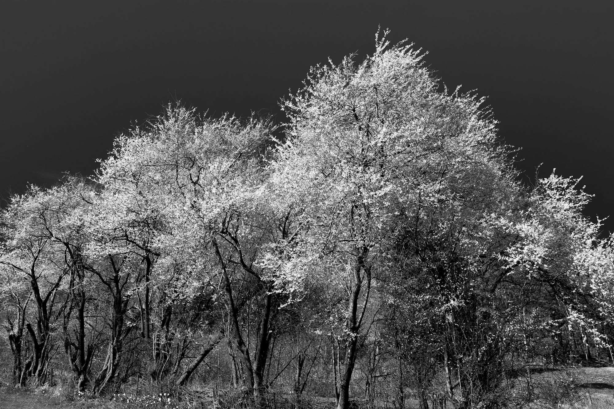 Den rosa japanske kirsebærblomsten – sakura – får mer og mer innpass i urbane strøk både her i landet og ellers i Europa. Visst er den vakker, og som oftest vel frisért. Byens beplantninger kan ikke gjøre som de vil. Derfor er det noe eget å støte på store villkirsebærtrær når man minst venter det, som her langt ute på landsbygda i Vindafjord i Rogaland. Man reiser i helt annet ærend, og så bare dukker de opp, frodige og overveldende mot den knallblå himmelen. De gjør seg også godt i svart-hvitt, som en del fotografer ofte tyr til. Å tillegge et tre eller annen plante livsglede er å trekke det vel langt, selv om det ikke er ukjent i alternativ litteratur. Men det kan berike betrakteren.