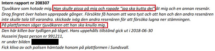 Av polisanmälan framgår att den aggressive mannen är den 25-årige asylsökaren Fayaz Hosseini från Afghanistan. Han drog sitt finger över halsen mot en kvinnlig tågvärd och sade att han skulle ”cutta” (slangord för knivskärning) henne. Fayez skulle även våldta kvinnan och urinera på henne. Nedan ett utdrag ur SJ:s interna rapport.