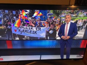 Neste stor-sak for TV2s nyhetsredaksjon denne kvelden er at det har vært avholdt Bygdepride (arrangement for homofile) på Sunnmøre. Vi får høre at det er fint at det ikke bare er i byen man kan være homofil. Det veives med regnbueflagg, og alle står på for saken.