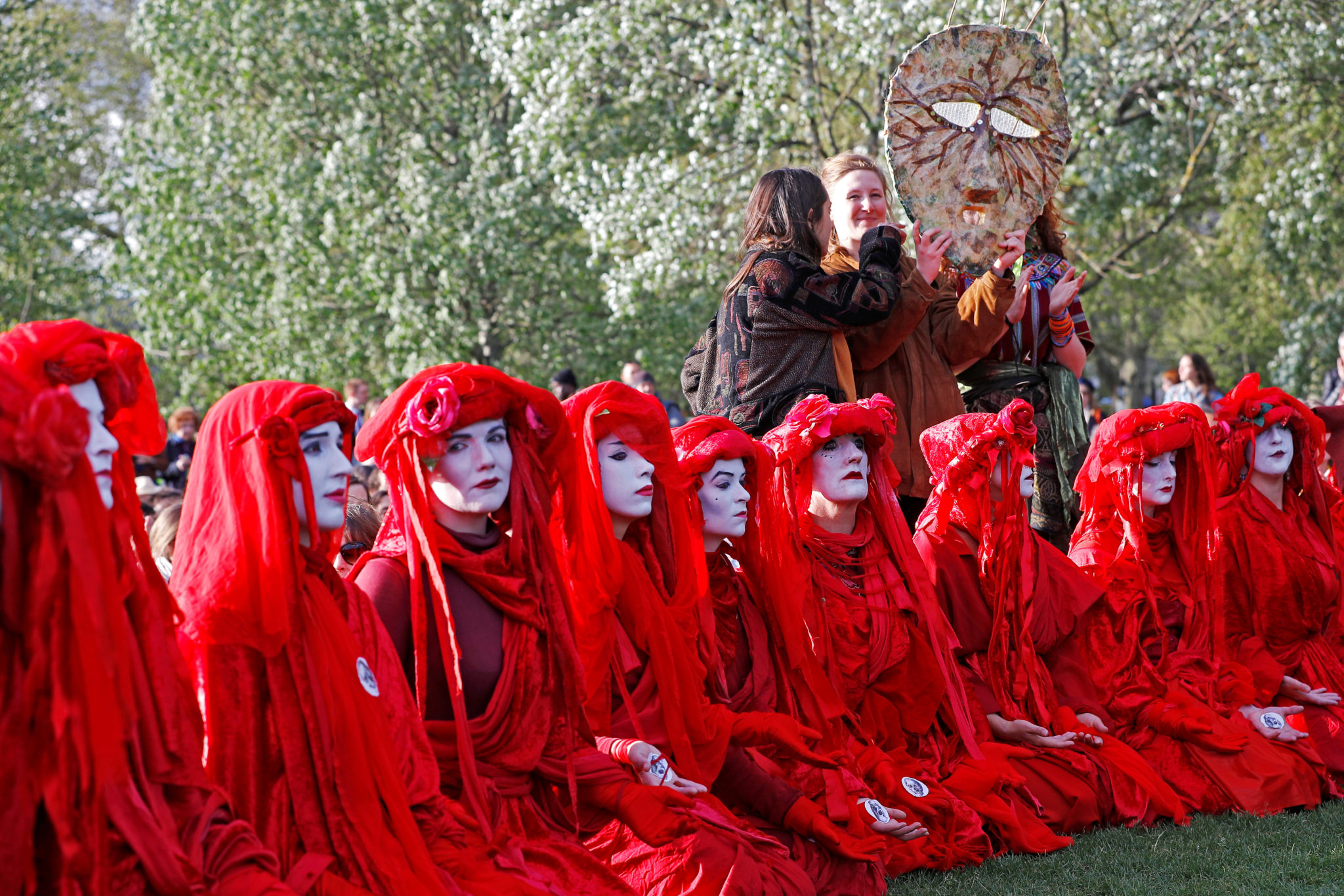 Rødkledte klimaaktivister med hvit ansiktsmaling deltar i avslutningen på demonstrasjonene kalt Extinction Rebellion i Hyde Park, London, den 25. april 2019. Foto: Peter Nicholls / Reuters / Scanpix.