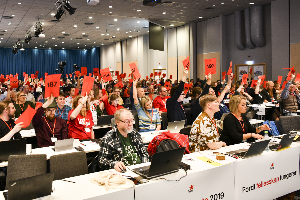 Avstemming under Rødts landsmøte lørdag ettermiddag T.h. på første rad sitter partisekretær Benedikte Pryneid Hansen og 2. nestleder Silje Josten Kjosbakken.