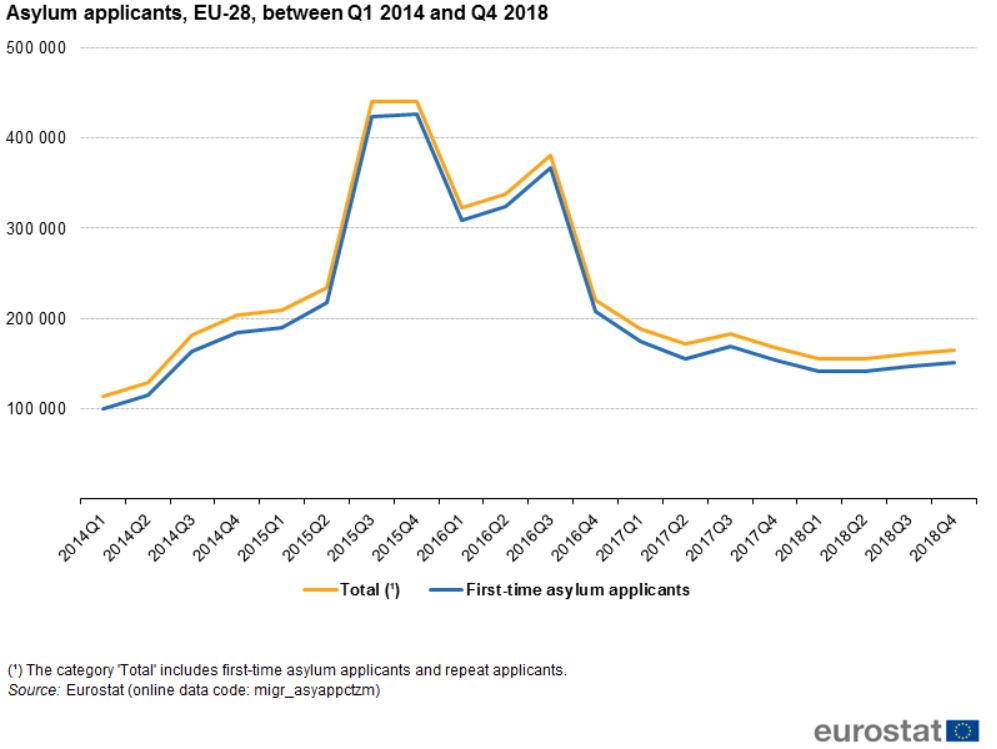 Eurostat oppgir da også at det i fjerde kvartal av 2018 var over 150.000 personer som søkte asyl i EU. Den største gruppen er syrere med 17.465, deretter afghanere med 12.200. Fra Irak er det kommet 9710.