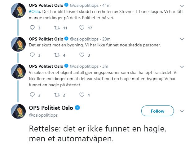 Politiet skrev at det er funnet en hagle på stedet, men rettet dette til automatvåpen. Det skal ha blitt skutt mot en butikk.